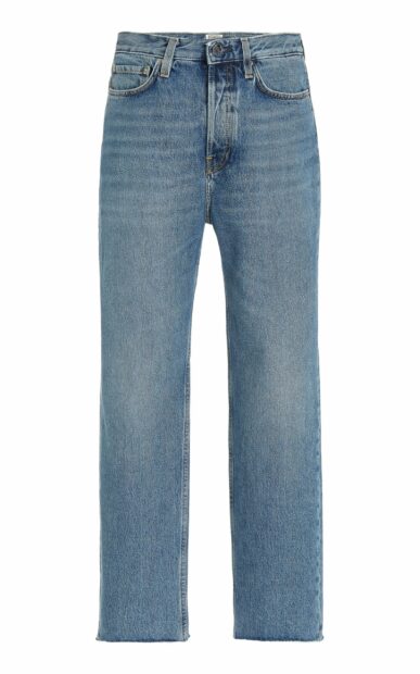 Totême’s classic cut denim jeans made in Italy with a rigid organic cotton fabric that is faded for a vintage wash and will mould to fit you perfectly over time. They are cut to a straight silhouette and have a high waist with a monogram button fly, a monogram leather patch, and cropped legs with raw hems. Wear everyday with flats or kitten heels.