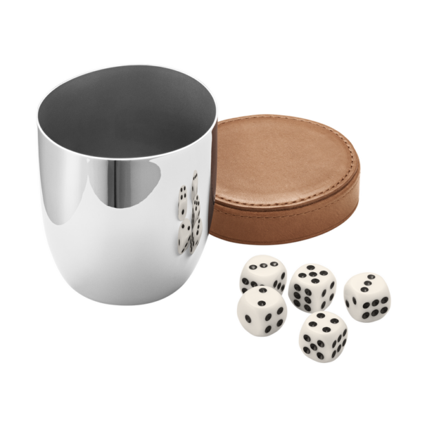 Løs det evige problemet med hva du skal kjøpe til noen som har alt! Dette stilige terningsettet med kopp i rustfritt stål er perfekt for alle som liker å spille spill hjemme eller på reise. Settet er et flott tilbehør til hjemmekontor eller spillrom. Den buede koppen er en fornøyelse å holde i og skinnhetten sitter godt på for risting og transport.