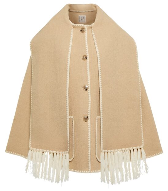 This Totême jacket masters the craft of practical perfection, with a built-in, fringe-trimmed scarf. Cut from a sturdy wool-blend to an oversized fit, it’s designed with dropped shoulders, wide sleeves, and contrast, crochet stitching.