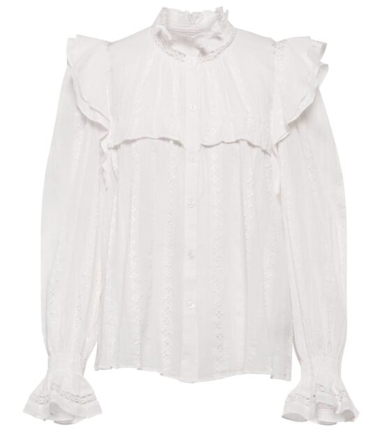 Designed with ruffled trims, the Jatedy blouse from Isabel Marant, Étoile is a brand signature style. It’s made from gauze with tonal embroidery and lace accents around the cuffs and collar.