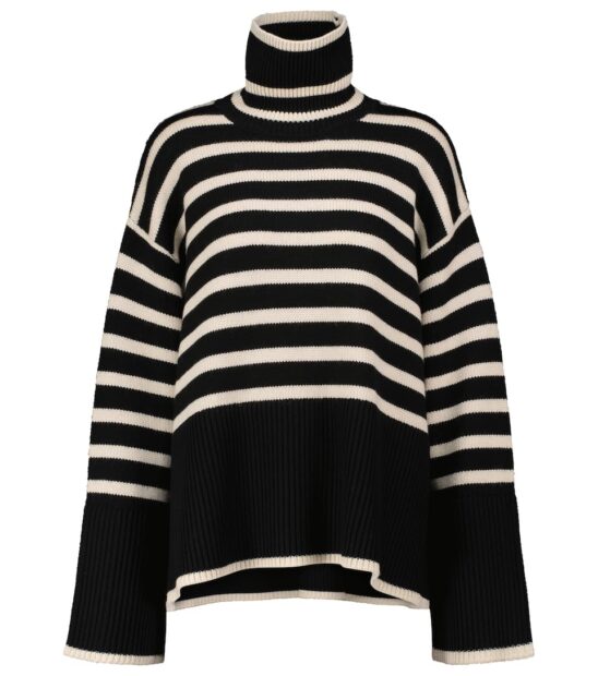 Relaxed turtleneck cut from the softest merino wool plated with organic cotton. It’s designed for an oversized fit and shaped to a wide silhouette and has a ribbed turtleneck, dropped shoulders, wide sleeves, side slits, and a cropped length.